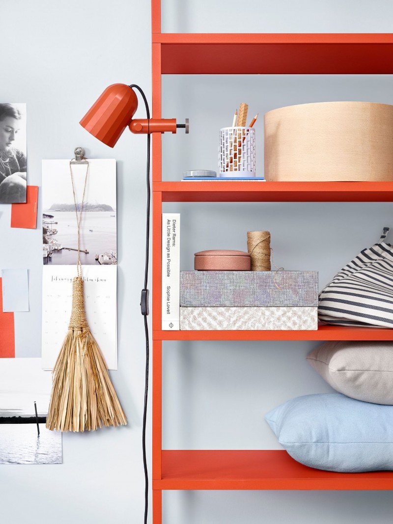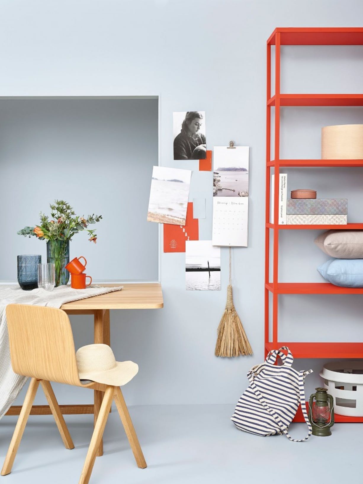 Begin by taking time to understand whether you want your furniture piece to be a standout or a subtle element that feels part of its surroundings, as this will inform the colour direction for your project. Picking up cool tones of grey with a light blue tinge, K498 Haven from our Feel the Colour collection was chosen to refresh the home office walls. Using colour to add contrast can give your room a unique spin that feels personal to you and a sophisticated finish that is often achieved by an accomplished interior designer. For a warm burst of colour to contrast with the blue-grey backdrop, we tinted the sophisticated matt finish of the Helmi 10 paint the vibrant M316 Tomato, adding a striking feature element to the home office décor. The interior's flat surface was enriched with spicy orange tones to beautifully emphasise the blue-grey wall paint while adding layers of depth and dimension to the workspace. Even the small spotlight was given a refresh to tie in neatly with the shelving unit.