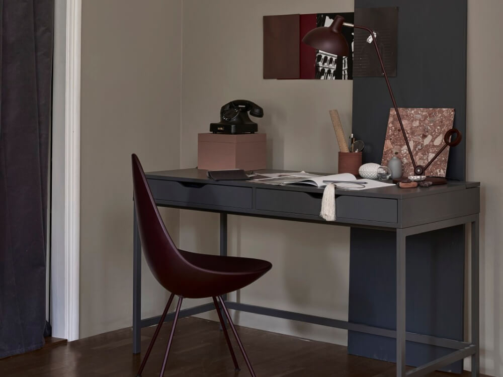 Dark greys and blue paints can be very effective in creative spaces. Our TVT M357 paint works well in home offices of any size. If you're decorating a smaller room, use high gloss furniture and light fabrics to give the illusion of space.