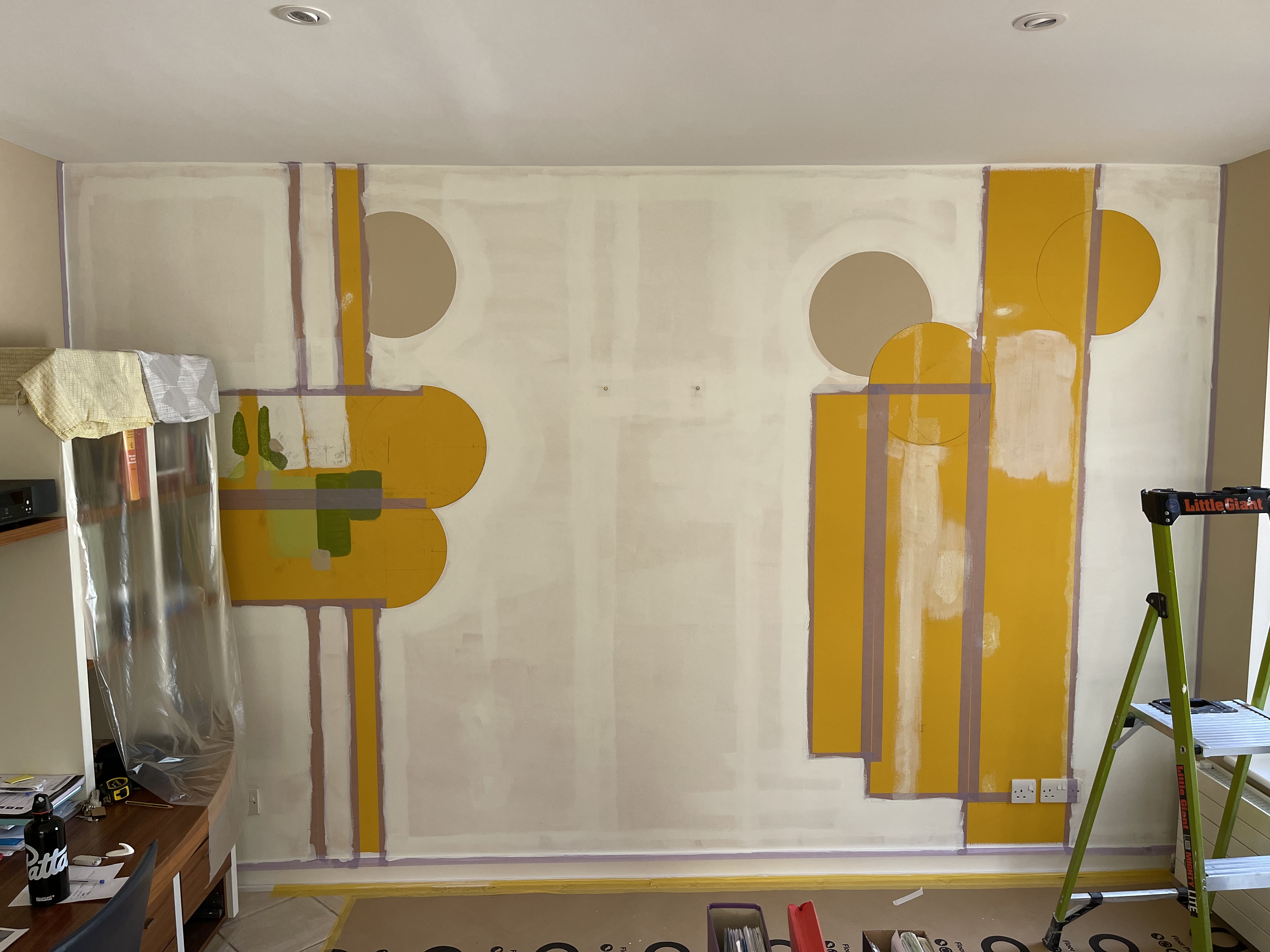 Luke designed an original mural in close collaboration with the client, ensuring the mural was as personalised as possible. Firstly, the walls were washed down, and any imperfections were filled. With the surface now smooth, it was time to free-hand sketch the shapes and silhouettes; then, using Deltec Gold, each shape was taped off and ready for paint.