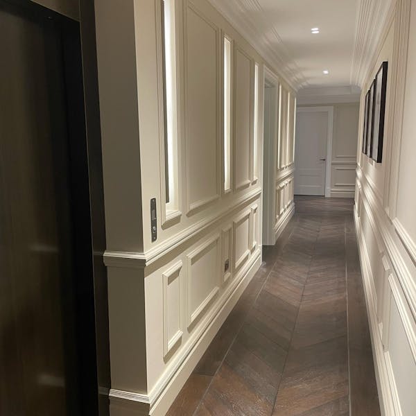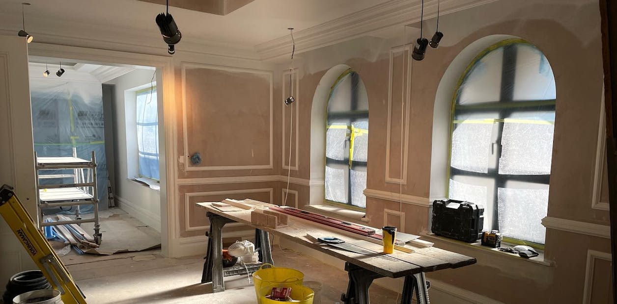 Before the magic began, the Emerson Park Decorators team got everything ready with great care. They covered up all the furniture, sockets, and special features like the marble fire surround to make sure no dust or paint could cause damage. Next, the wooden paneling was put up with impeccable precision, adding more character and a personalised touch to the home.
