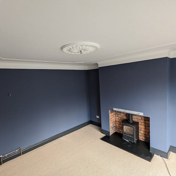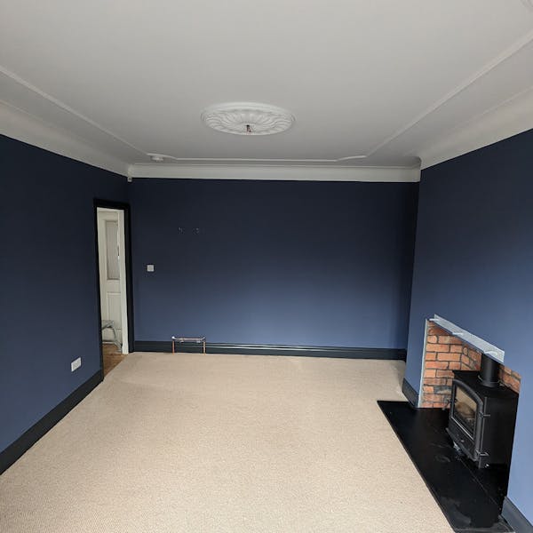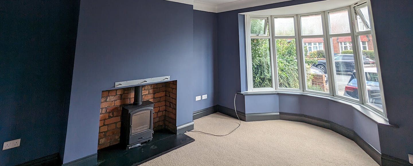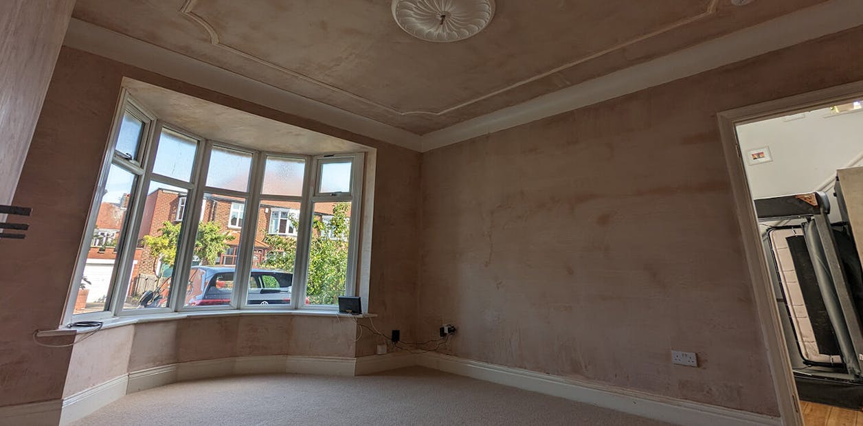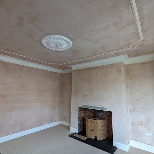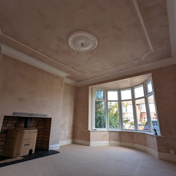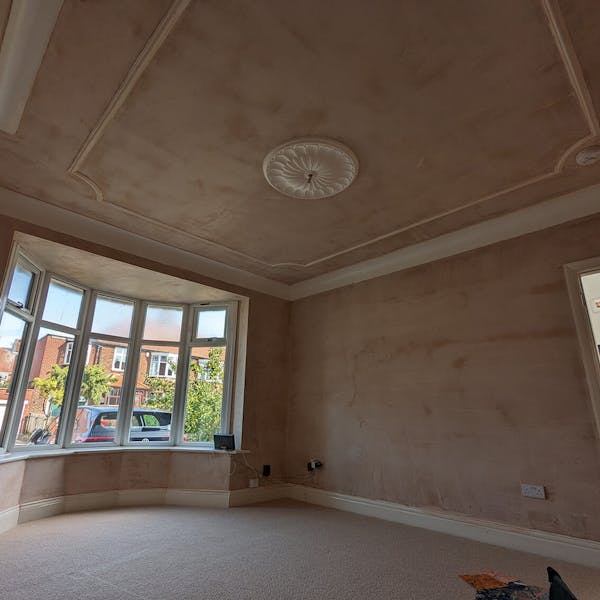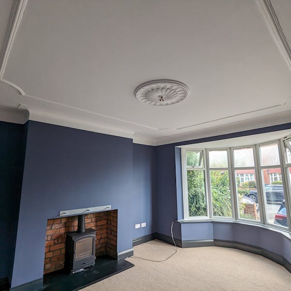 ReNew Professional Decorating Services started by carefully assessing the state of the living room's walls, ceilings, and woodwork. Even in a freshly plastered room, there can still be areas that need an extra bit of TLC. Any damaged areas of paint on the original period coving were removed, and cracks were raked out, creating a smooth and even surface.