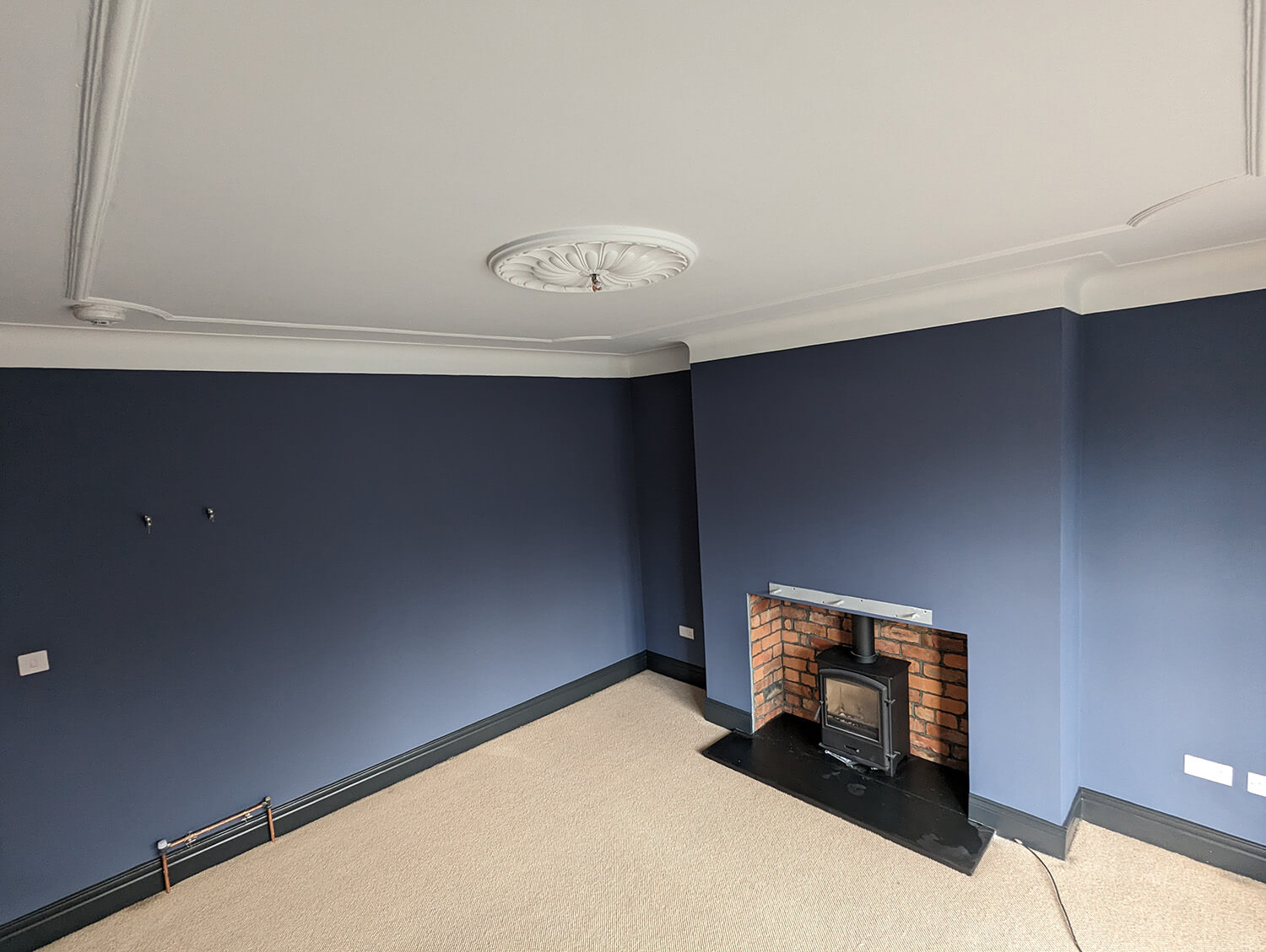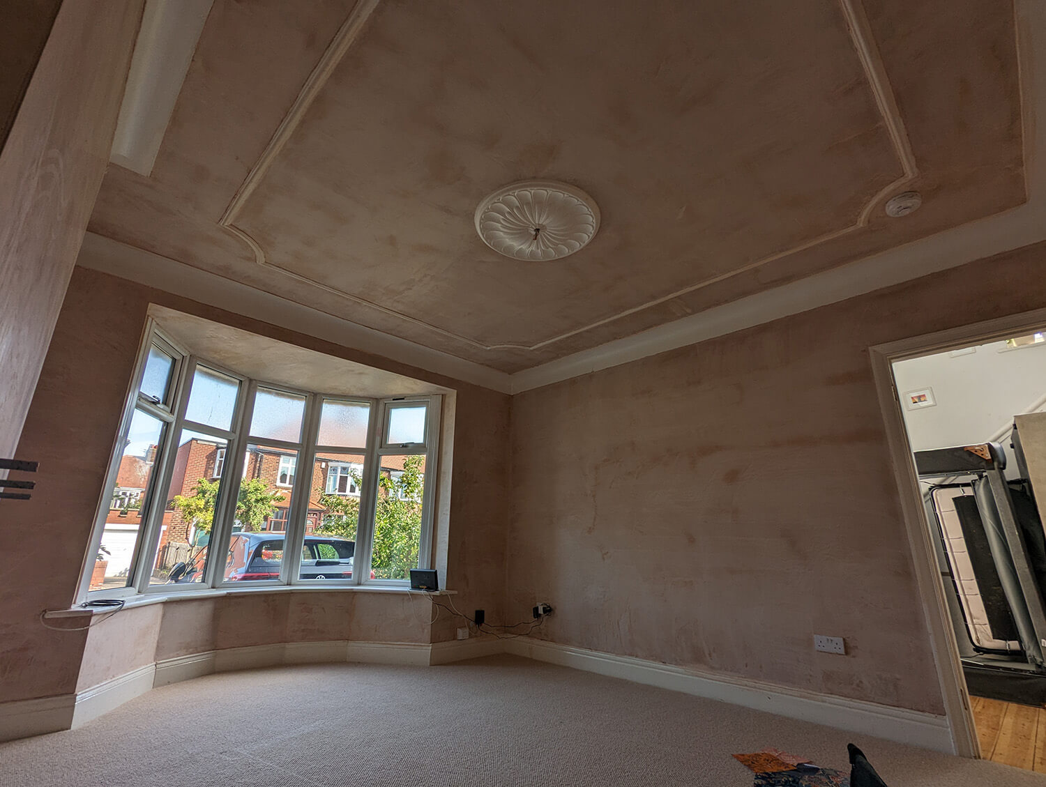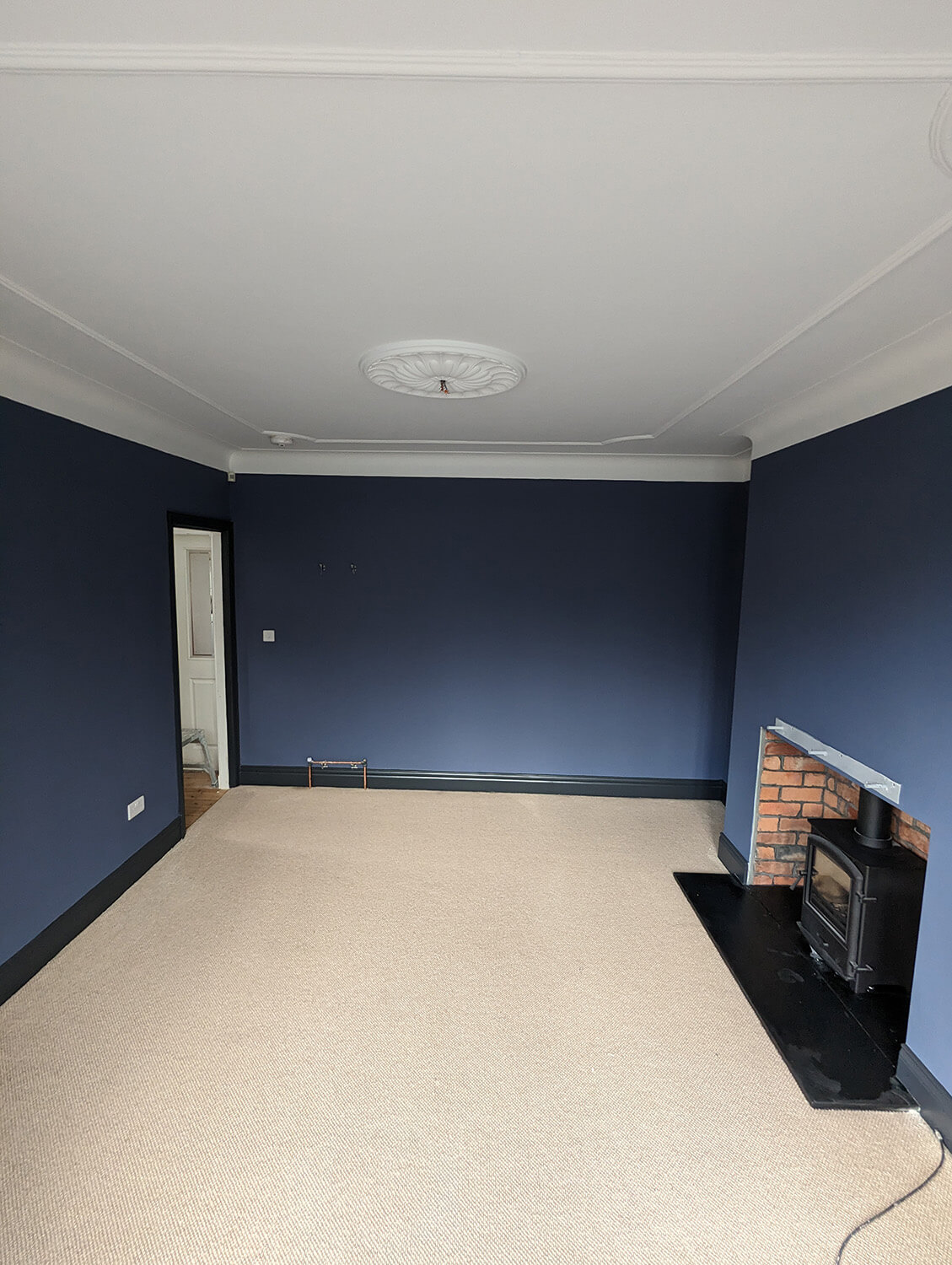 ReNew Professional Decorating Services started by carefully assessing the state of the living room's walls, ceilings, and woodwork. Even in a freshly plastered room, there can still be areas that need an extra bit of TLC. Any damaged areas of paint on the original period coving were removed, and cracks were raked out, creating a smooth and even surface.